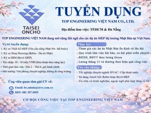 Tuyển dụng Kỹ sư BIM (MEP) tại TEVC Hồ Chí Minh, Đà Nẵng 10/2025 Top Engineering Việt Nam (TEVC), công ty thành viên của Tập đoàn Taisei Oncho Nhật Bản, đang mở đợt tuyển dụng Kỹ sư BIM (MEP) tháng 10/2025 tại TP.HCM và Đà Nẵng. Đây là cơ hội dành...