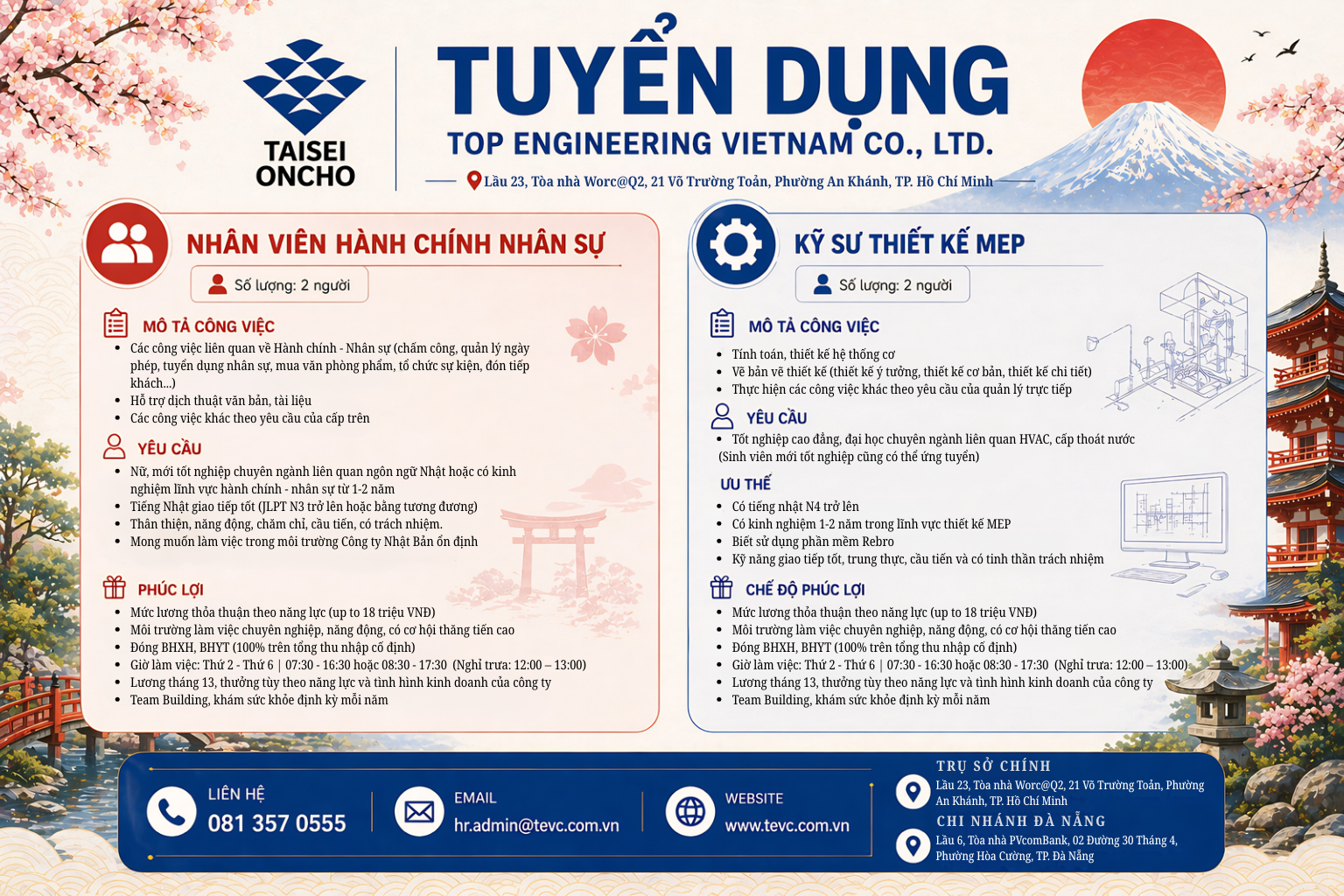 09/04/2026Công ty TNHH Top Engineering Việt Nam (TEVC), thành viên của Taisei Oncho Co., Ltd. (Nhật Bản), thông báo tuyển dụng nhân sự tháng 04/2026 như sau: